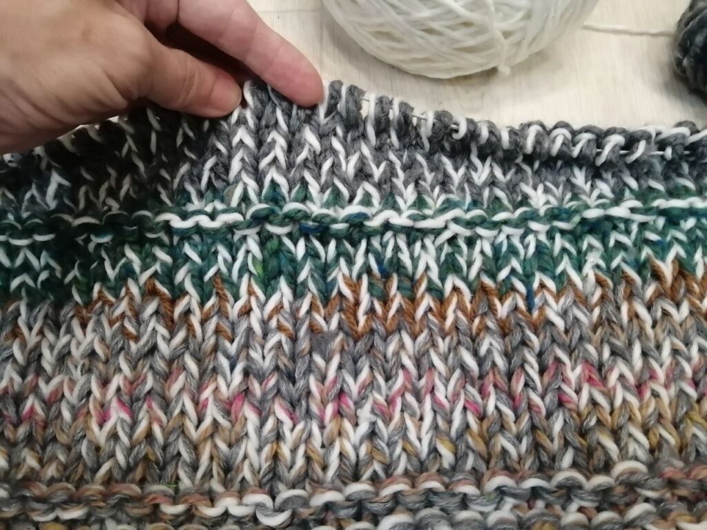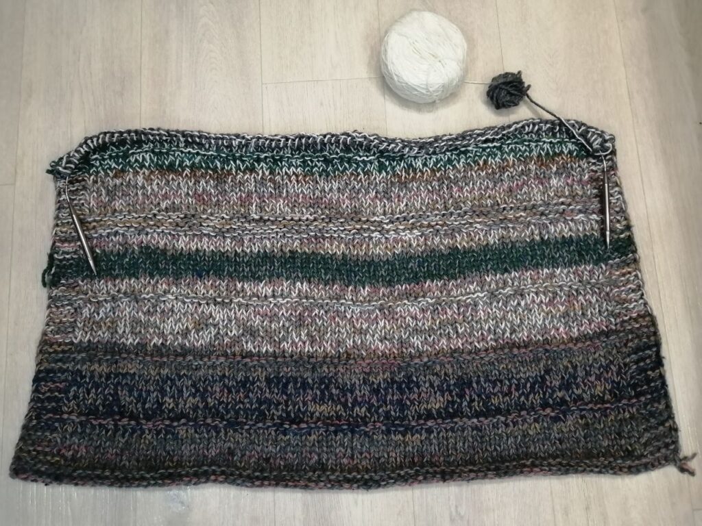 Фото поближе, видно что петли крупные, вязать конечно непривычно мне, после того как вяжу обычно на маленьких спицах, но для разнообразия можно 🙂