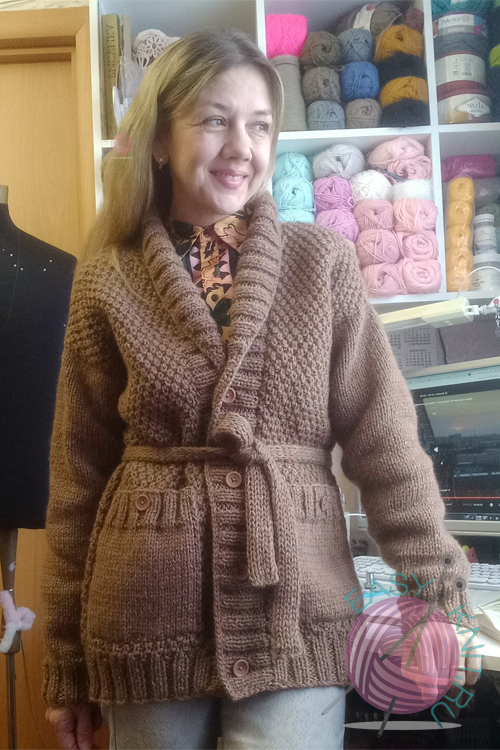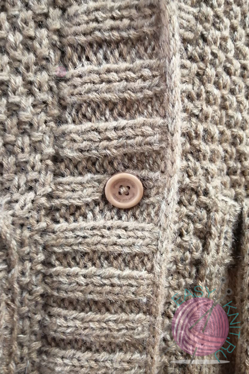 Вязала отдельными частями: перед, 2 полочки и рукава, ах да еще был пояс. Низ, манжеты, планка под пуговицы и воротник связаны резинкой 2 на 2. Рукава и карманы связаны обычной лицевой гладью, спинка и полочки узором «Крупный жемчуг».