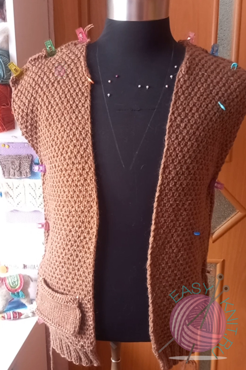 Промежуточный результат на манекене, спинка и 2 полочки, на место кармана пока прикрепила образец, который вязала в самом начале, решила карманы и рукава вязать лицевой гладью, хотя изначально планировала все вязать узором, но думаю так получилось поинтереснее.