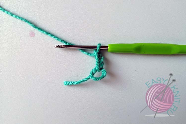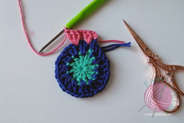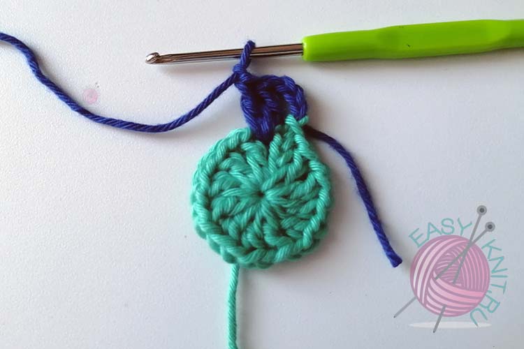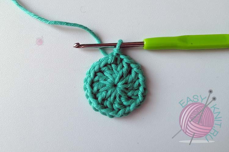 Берём нить другого цвета. Делаем 3 петли подъёма, затем 2 столбика с накидом в промежуток между первым и вторым столбиком первого ряда. Далее 1 воздушная петля и повторяем до конца ряда: в каждый промежуток — по 2 столбика с накидом, чередуя с 1 воздушной петлёй. В последний промежуток вяжем 1 столбик с накидом и соединяем ряд соединительным столбиком с верхней третьей петлёй подъёма.