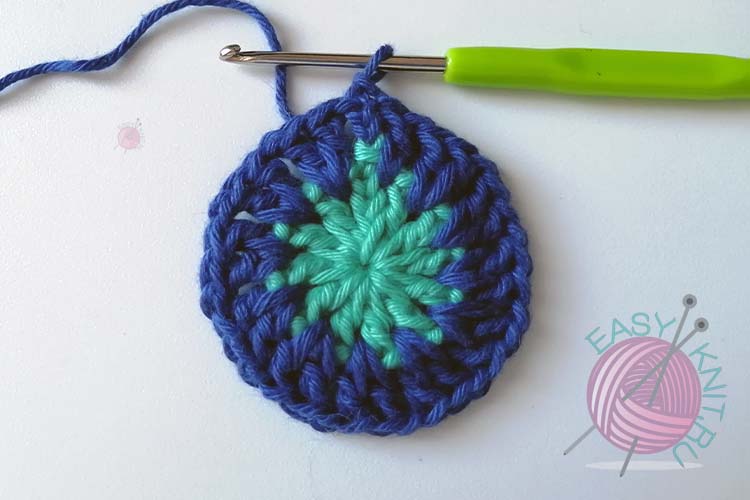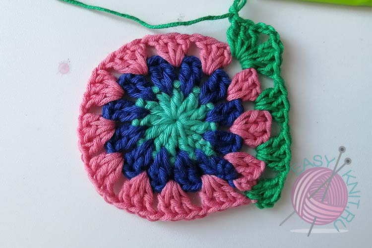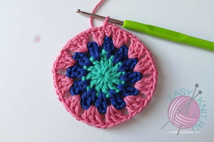 Снова меняем цвет. 3 петли подъёма + 2 столбика с накидом в арку из 3 воздушных петель предыдущего ряда. Далее воздушная петля, и продолжаем вязание как в предыдущем ряду — по 3 столбика с накидом в каждую арку. Повторяем до конца ряда, соединяем соединительным столбиком и обрезаем нить.