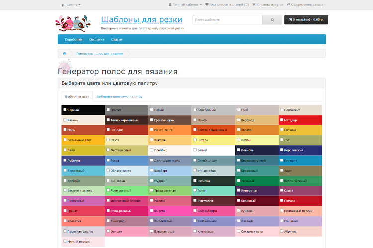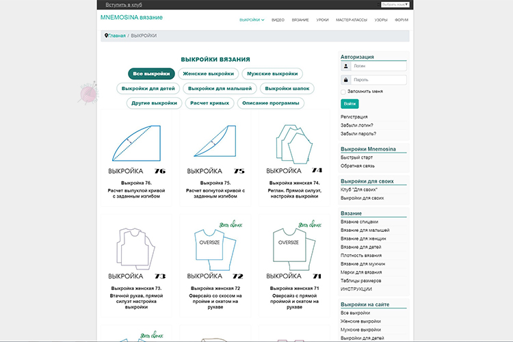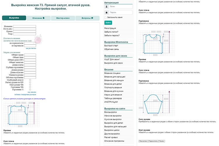 Mnemosina — один из самых известных русскоязычных сервисов для расчёта выкроек вязаных изделий. Вы выбираете тип модели (женская, мужская, детская), вводите свои мерки и плотность вязания, а сайт рассчитывает количество петель и рядов, убавки и прибавки по выкройке.