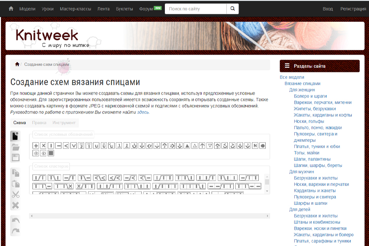 На Knitweek, помимо подборок переводов описаний, есть собственный онлайн‑инструмент для создания схем вязания спицами. По сути это ещё один формат «клетчатой бумаги» в браузере, где вы заполняете клетки условными значками и получаете аккуратный результат, готовый для вставки в мастер‑класс или личные записи.