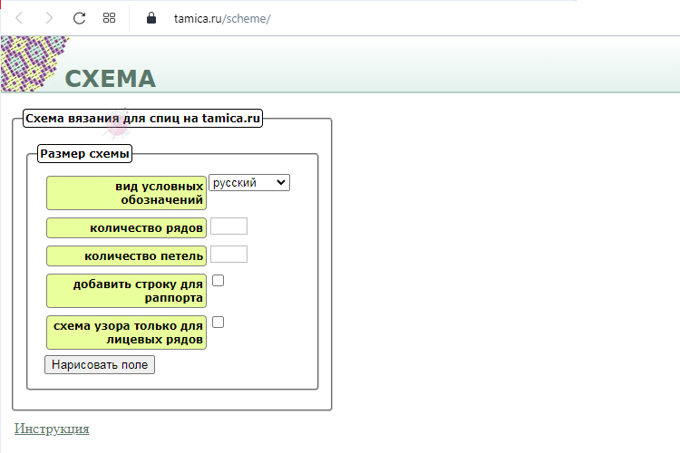 Tamica — простой онлайн‑редактор схем для вязания спицами. В нём можно нарисовать узор любой сложности, задать раппорт, а под схемой автоматически появится расшифровка каждого условного обозначения.