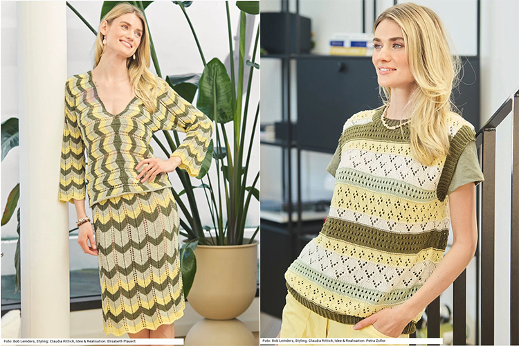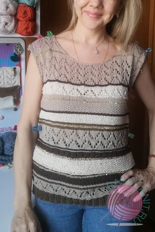 Особенно зацепила модель жилета в полоску с разными ажурными узорами. Она очень перекликается с моим текущим процессом: сейчас я вяжу джемпер с похожим сочетанием полос и ажура, и как раз тестирую, как такие узоры ведут себя в носке. Здесь как раз можно показать этот процесс на себе и сравнить, как идея из журнала выглядит «в жизни». Уже беру новые сочетание узоров на будущее.