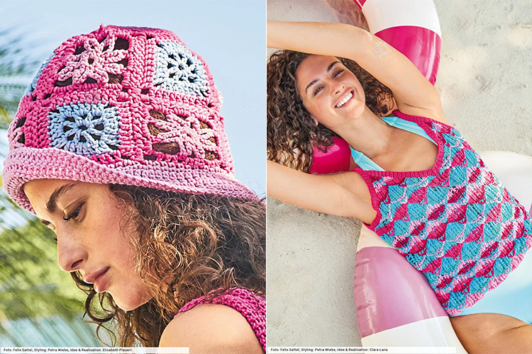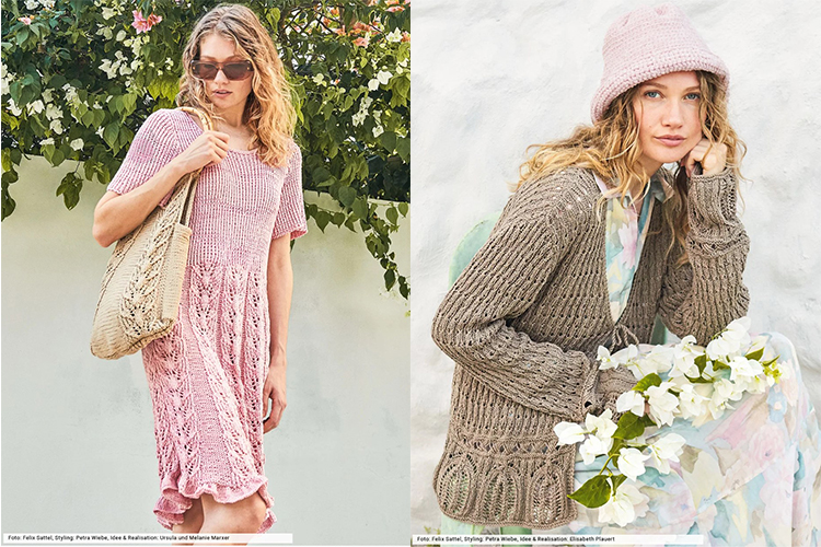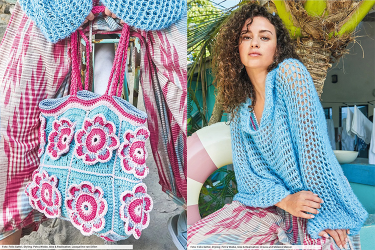 Кроме одежды, в журнале представлены аксессуары: сумки и панамы, большие шали и палантины, а также крупная сумка‑шоппер из цветочных мотивов крючком. Есть и несколько простых проектов для дома — в духе «Wohnaccessoires»: вязаные пледы или декоративные элементы, которые позволяют использовать остатки пряжи и поддержать общую летнюю атмосферу.