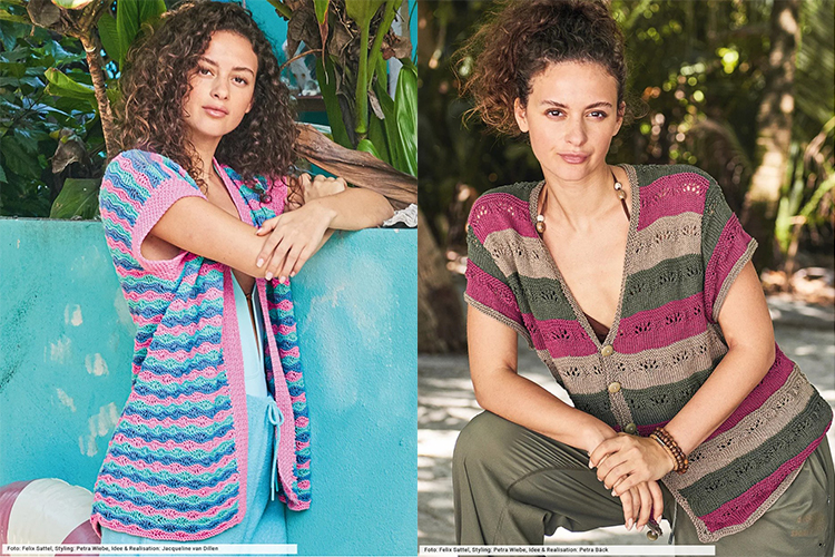 Сильная линия номера — струящиеся длинные жакеты и кардиганы‑кафтаны, которые работают как верхний слой в летних образах. В журналах Verena такие модели обычно выполняются из хлопка или смесовой пряжи с льном и имеют удлинённый силуэт, ажурные вертикальные полосы и мягко падающие полочки. Есть и более короткие варианты: белый жакет с бахромой, лёгкий голубой сетчатый пуловер‑кардиган — они рассчитаны на многослойность и удобно надеваются поверх платьев и топов.