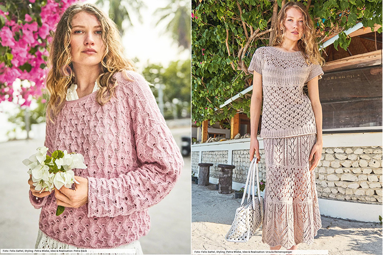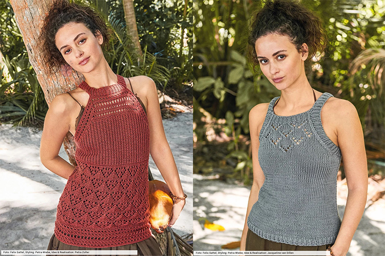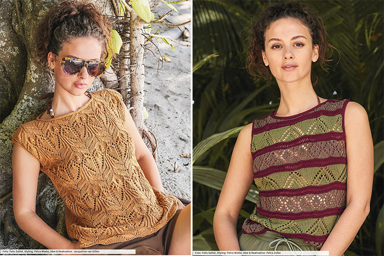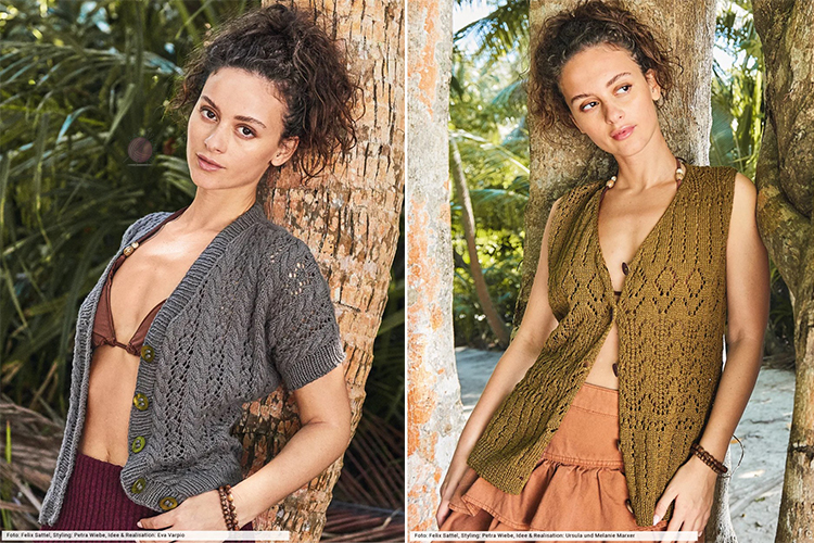 Выпуск предлагает несколько вариантов ажурных пуловеров — от пудрового рельефного свитера до лёгких моделей с полностью сквозным узором, которые подходят для лета. Есть укороченные топы и жилеты, в том числе в спортивном и пляжном стиле, с гладью вверху и ажуром или сеткой по низу, завязками на плечах, шнуровкой и бахромой. Отдельный блок занимают белые топы и кардиганы: сочетание мелкой фактуры, кос и вертикальных дорожек визуально вытягивает силуэт и подчёркивает лаконичный, «чистый» образ.