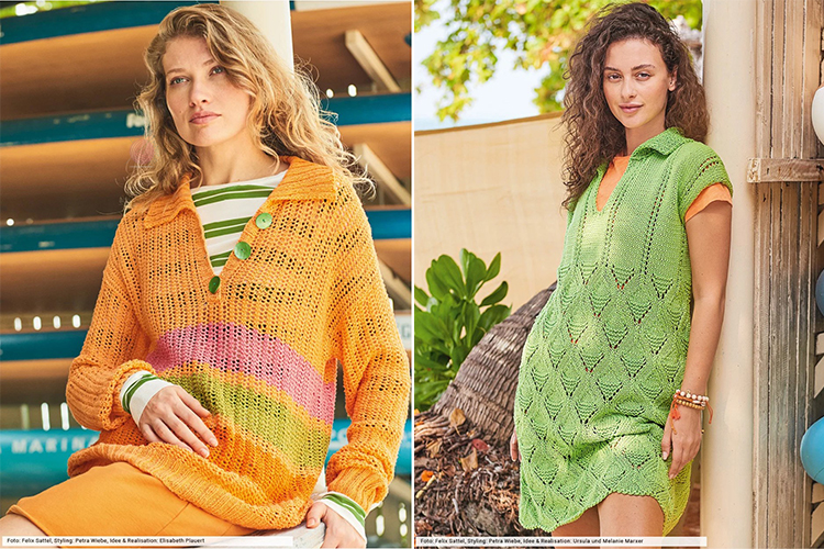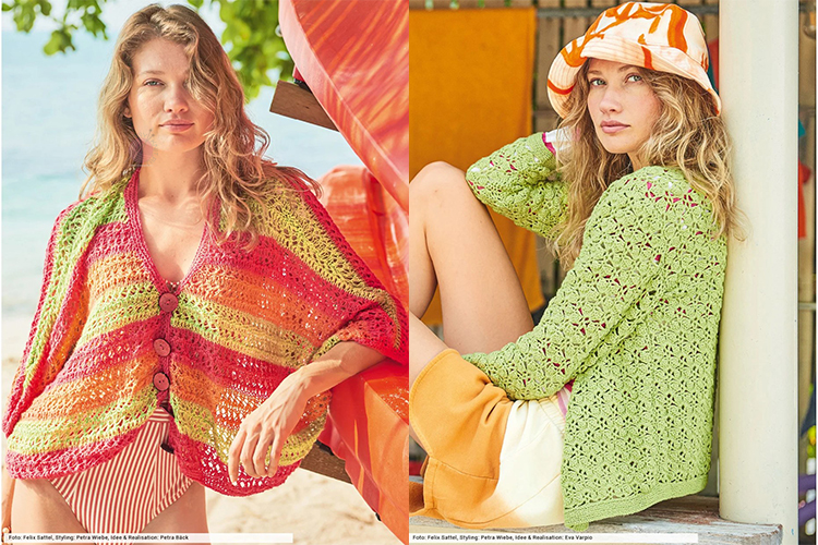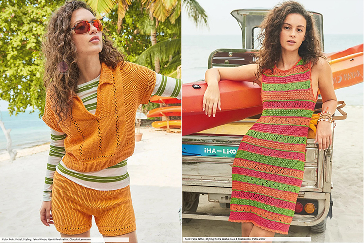 В выпуск включены длинные ажурные платья и пляжные туники, которые можно носить и как самостоятельные вещи, и поверх купальника. Есть как монохромные варианты в светлой гамме, так и яркие полосатые модели в апельсиново‑зелёной палитре, где сочетаются разные виды ажура. Отдельный раздел посвящён пляжным стилям: вязаные бикини/комбинезоны с крупным ажуром, модели с бахромой, цветной шаль‑платок и сетчатые юбки‑парео.
