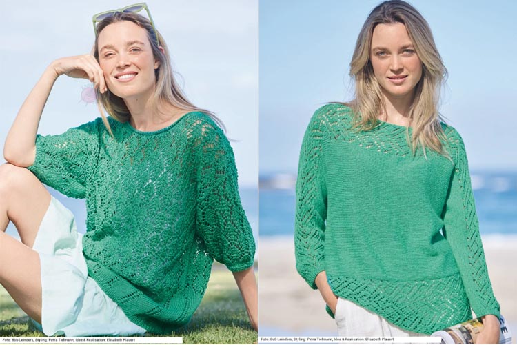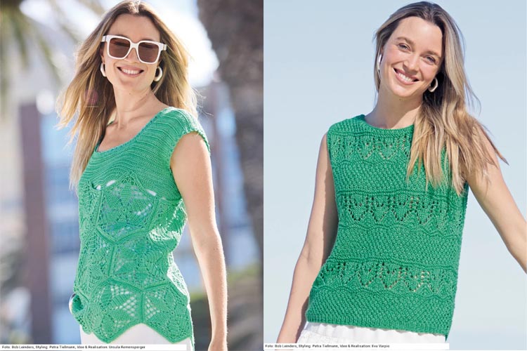 Среди зелёных моделей в журнале Sabrina 6/2026 особенно выделяется лёгкий зелёный топ с ажурными вставками. За счёт свободной посадки и тонкой пряжи это отличный вариант летней модели спицами для самых тёплых дней.