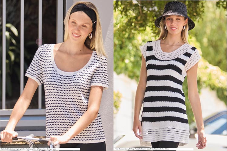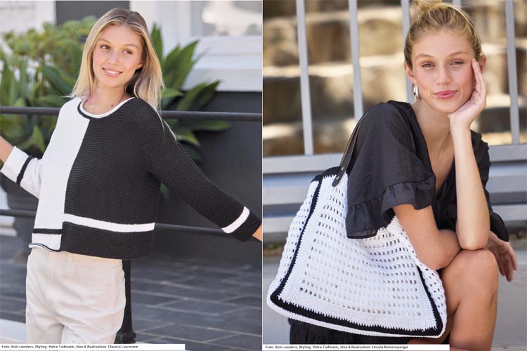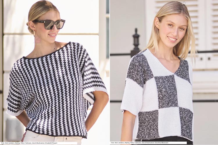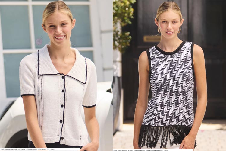 Второе направление выпуска Sabrina 6/2026 — это современные модели в чёрно‑белой гамме с графичными структурами. Такие вещи подойдут тем, кто ищет удобный городской трикотаж и практичные летние модели спицами для работы и прогулок.