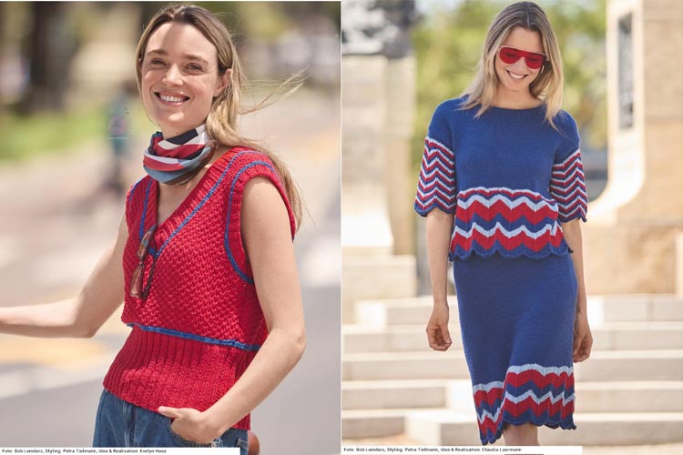Для любителей цвета в журнале Sabrina 6/2026 представлены эффектные модели в насыщенных оттенках красного и синего. Это яркие летние модели спицами, которые становятся главным акцентом образа и хорошо смотрятся как в дневных, так и в вечерних комплектах.