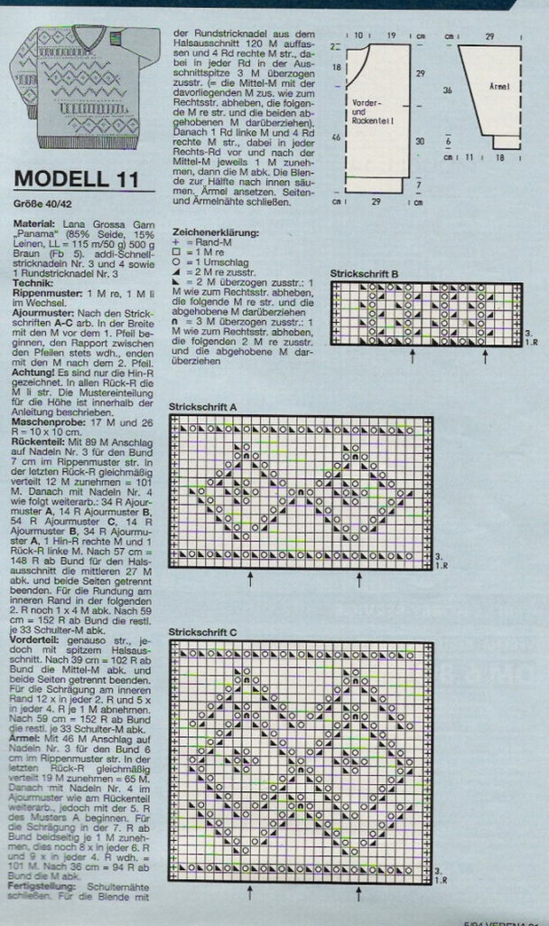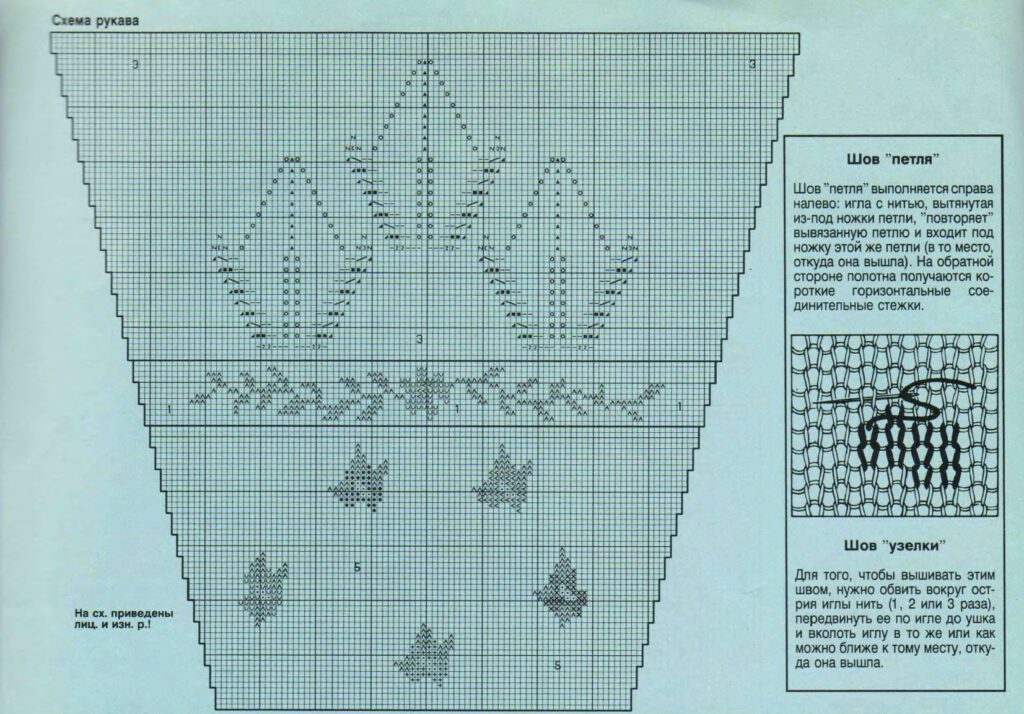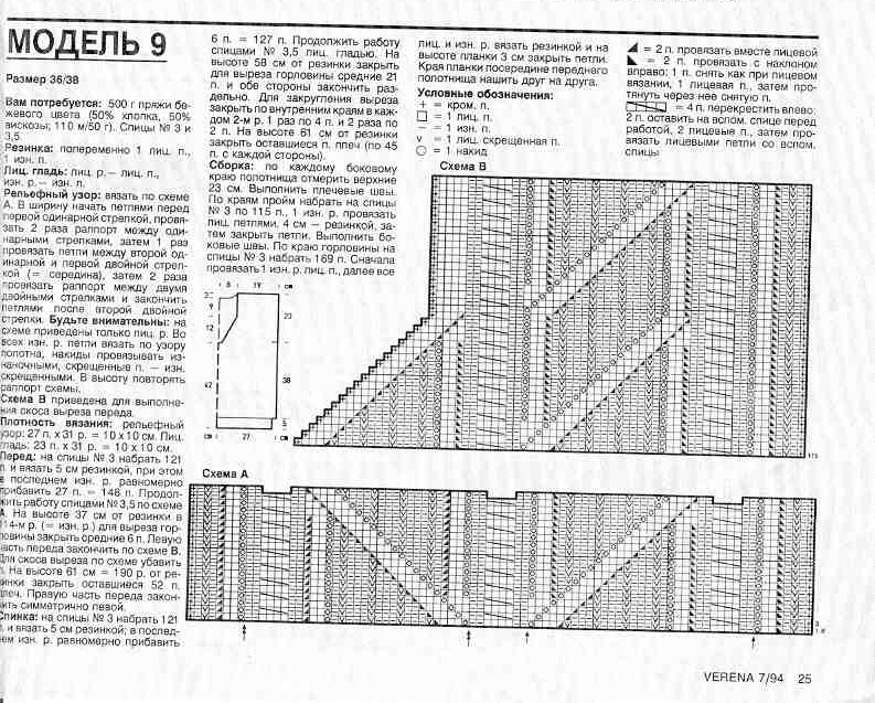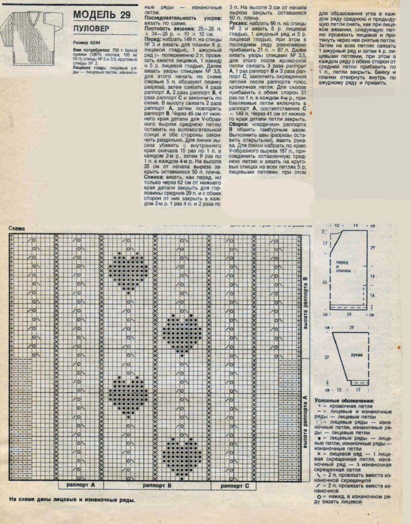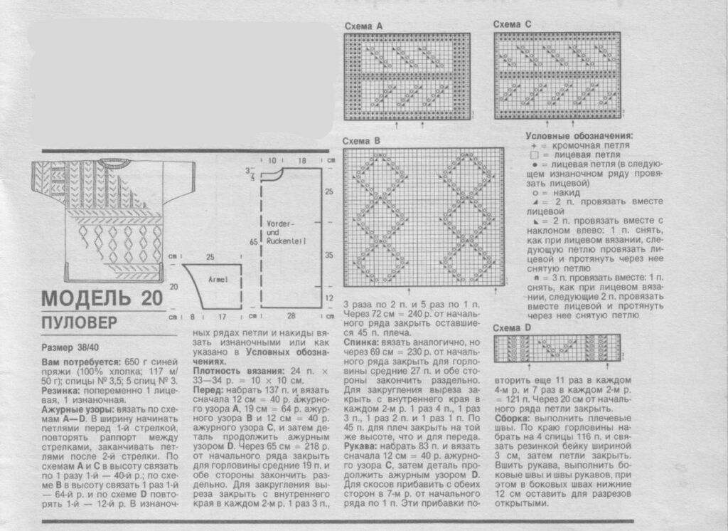 - На схемах A, B и C (не приложены к тексту, но упоминаются в оригинале) даны только лицевые ряды. В изнаночных рядах все петли вязать изнаночными.