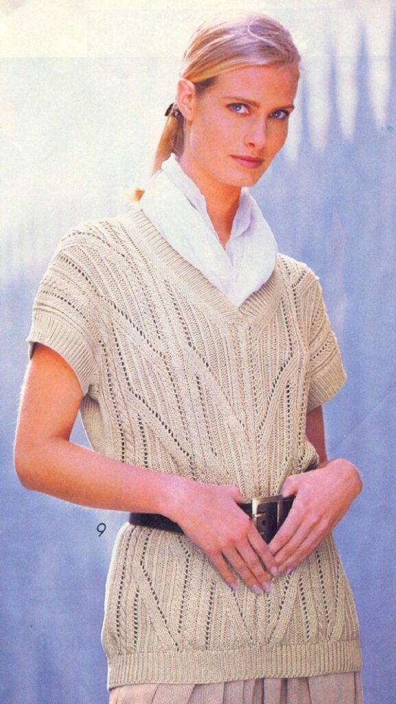 Пуловер спицами «в дырочку» или сеточкой — это почти готовая идея для современного летнего свитера, который можно носить и на голое тело, и поверх топа или платья. В 2026 году особенно актуальны воздушные вещи с эффектом полупрозрачности, поэтому старую вереновскую модель можно освежить за счёт более тонкой нити, мягкой посадки и, возможно, слегка укороченной длины. Такой джемпер отлично смотрится в отпускных образах с льняными брюками и шляпой, а в городе — с джинсами и минималистичными украшениями.