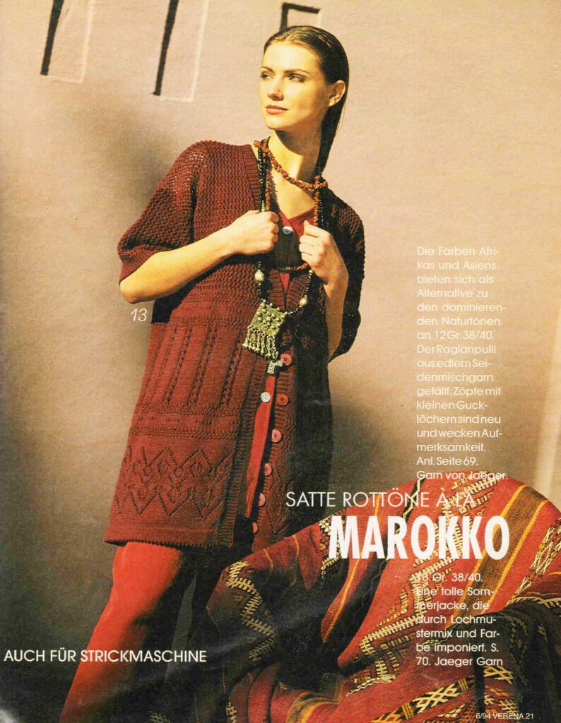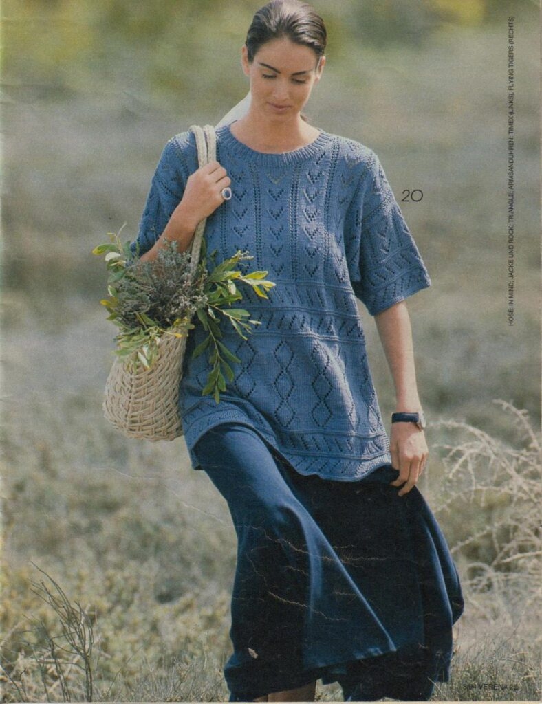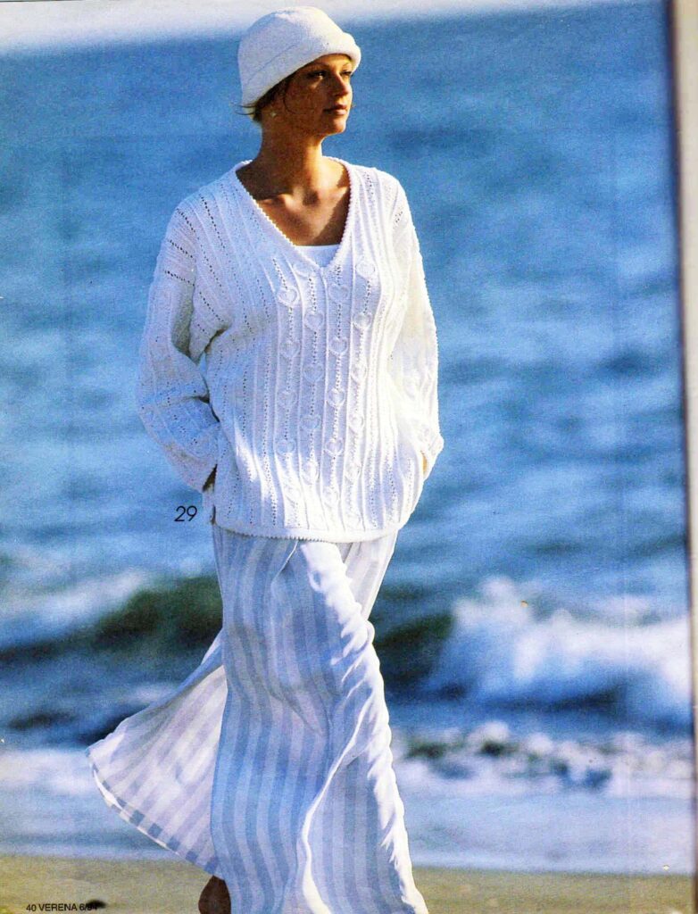 Фантастический летний джемпер, впечатляющий сочетанием ажурных узоров и цвета, — пример того, как Verena умела работать с яркой палитрой и сложными рисунками. В 2026 году такой подход можно переосмыслить: оставить идею яркого акцентного джемпера, но выбрать современные оттенки — коралловый, холодный бирюзовый, лаймовый или, наоборот, приглушённые «припылённые» тона. Главное — не бояться цвета и дать ажуру «дышать», чтобы модель смотрелась не тяжёлой, а именно летней и лёгкой.